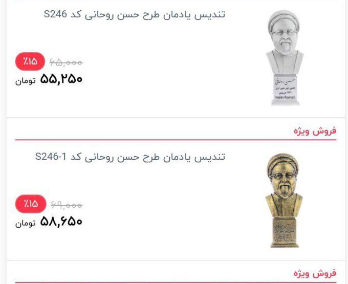 حالا یکی از همین فروشگاه ها تندیسی از حسن روحانی رییس جمهور کشورمان ساخته و آن را به فروش می رساند.جالب اینکه این فروش با 15 درصد تخفیف تا تاریخ معینی به فروش می رسد.