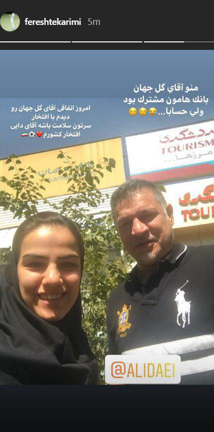 فرشته کریمی بازیکن تیم ملی فوتسال ایران تصویری از خودش به همراه علی دایی که به صورت اتفاق او را دیده، منتشر کرد. کریمی در استوری خود نوشت:«منو آقای گل جهان بانک‌هامون مشترک بود اما حسابا...»