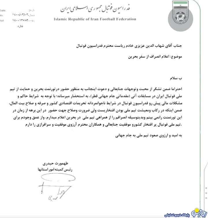 عضو هیات رییسه فدراسیون فوتبال از سفر به همراه تیم ملی صرف نظر کرد.