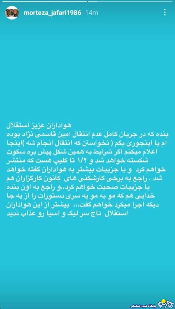 بعد از این ماجراها مدیر برنامه قاسمی‌ نژاد هم با انتشار یک استوری اعلام کرده که ویدیوهایی در اختیار دارد که در صورت لزوم آن را منتشر خواهد کرد تا خیلی از مسائل در مورد عدم انتقال این بازیکن به استقلال مشخص شود.