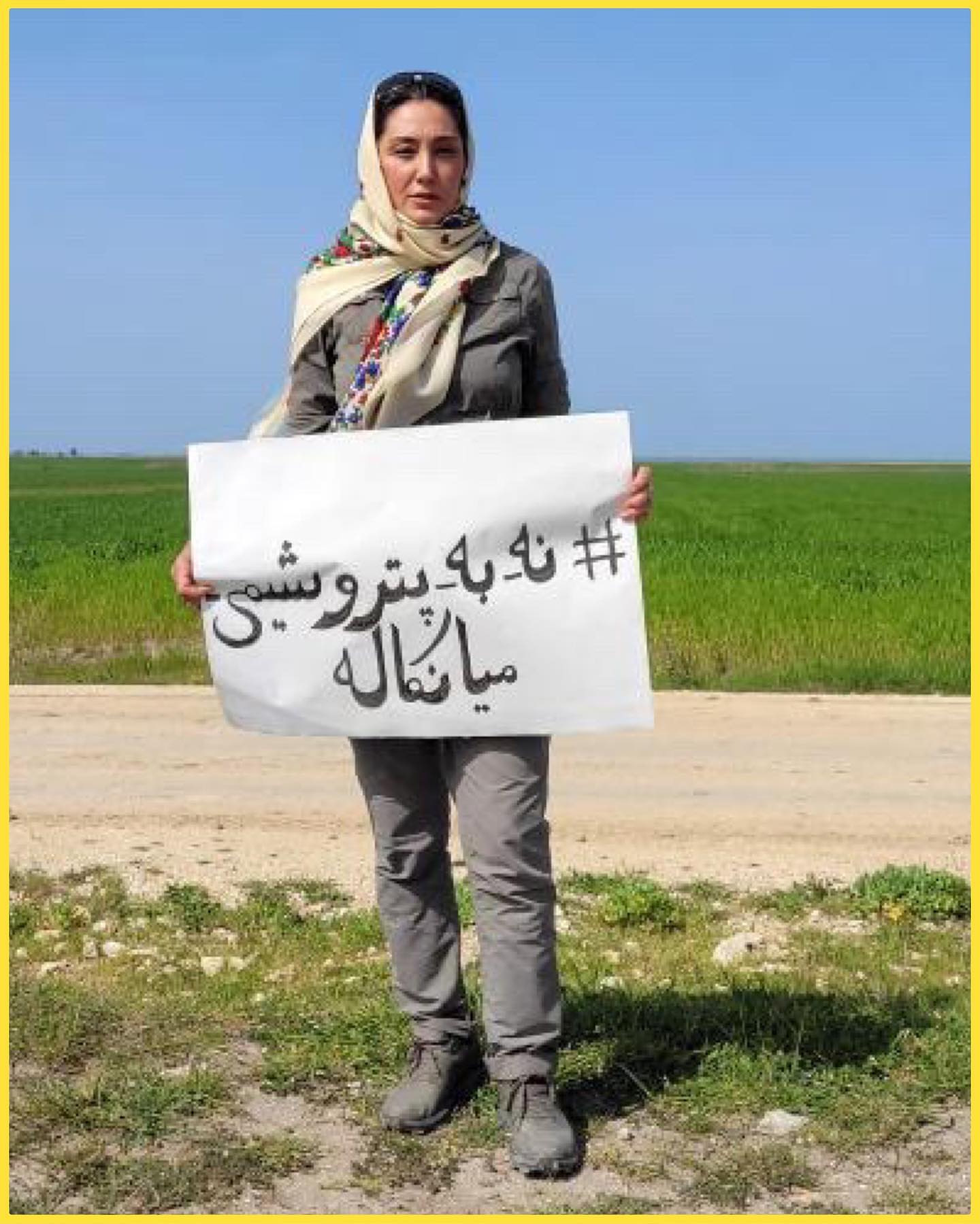 هدیه تهرانی با تابلوی «نه به پتروشیمی میانکاله»