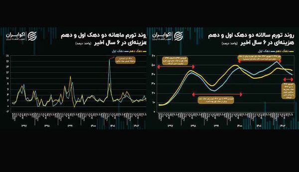 در این گزارش روند تورم سالانه و ماهانه در دهک دهم و دهک اول یعنی ثروتمندترین و فقیرترین دهک در شش سال اخیر در چهار بازه زمانی بررسی شده است. یک بازه ابتدای سال 1397 تا انتهای 1398 است که به طور کلی تورم سالانه این دو دهک با یکدیگر تقریبا منطبق بوده است. در بازه فروردین 1399 تا مهر 1400 دهک دهمی‌ها تورم سالانه بیشتری را نسبت به دهک اول تجربه کرده‌اند که می‌توان رد آن را در تورم ماهانه بالاتر این دهک در سال قبل مشاهده کرد.