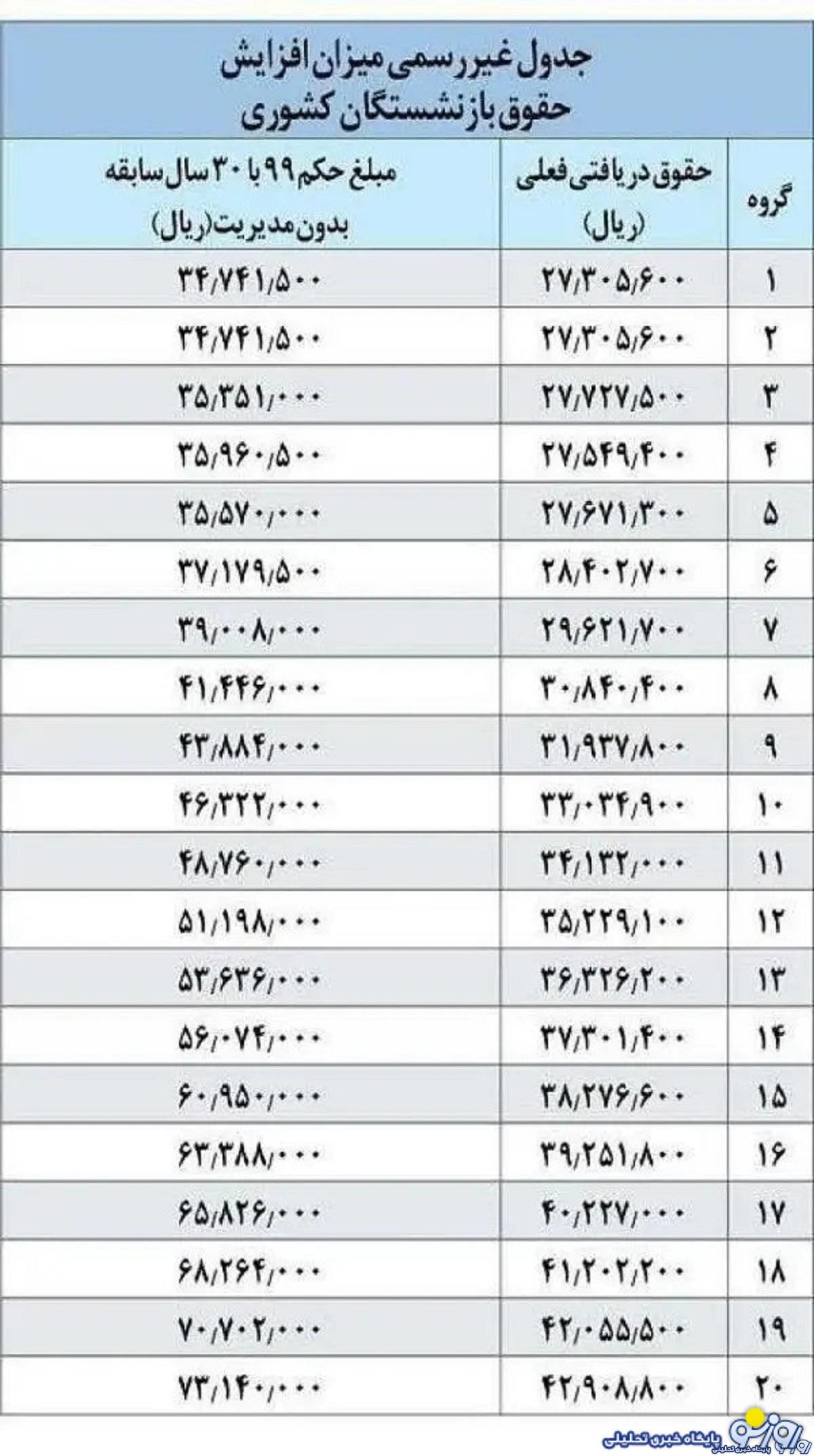 طبق جدول منتشر شده حقوق بازنشستگان کشوری حدود ۳۰ تا ۷۰ درصد افزایش پیدا می‌کند.