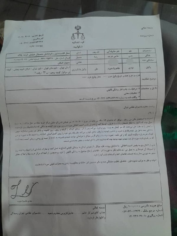 خانم عباسی تصاویری از شکایتش و اجازهی قاضی کشیک برای گرفتن فیلم دوربین مدار بسته و آثار باقیماندهی ضرب و شتم بر بدن دخترش را نیز برای ما فرستاده است.