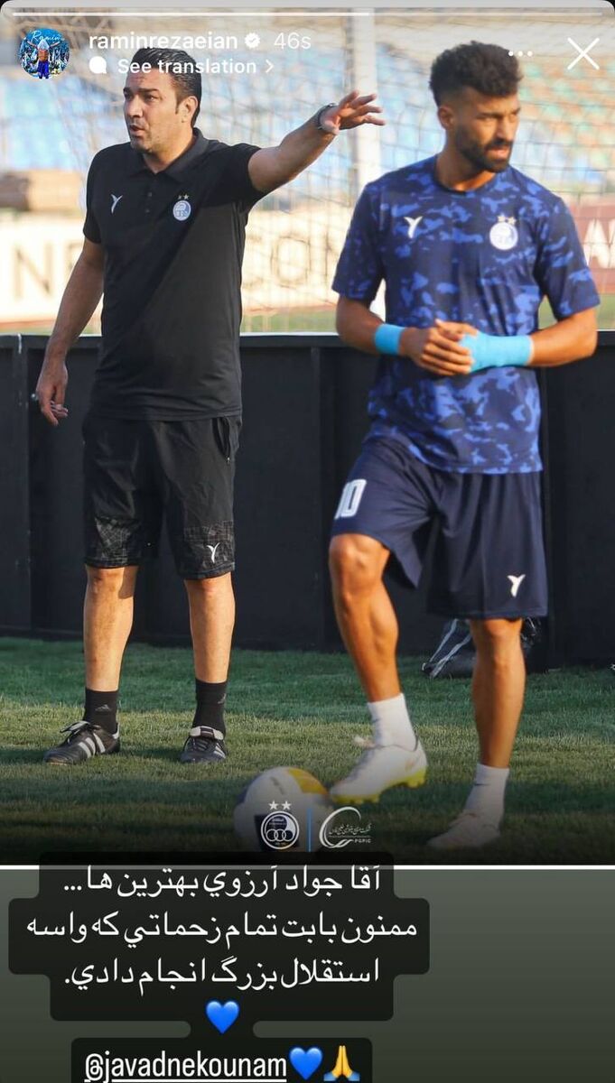 روزنو :رامین رضاییان پس از جدایی جواد نکونام از استقلال یک استوری برای او منتشر کرد.