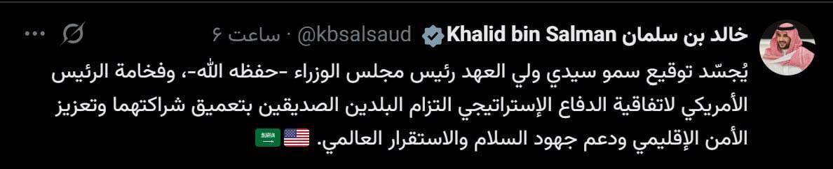 توییت خالد بن سلمان پس از امضای توافق دفاعی با آمریکا