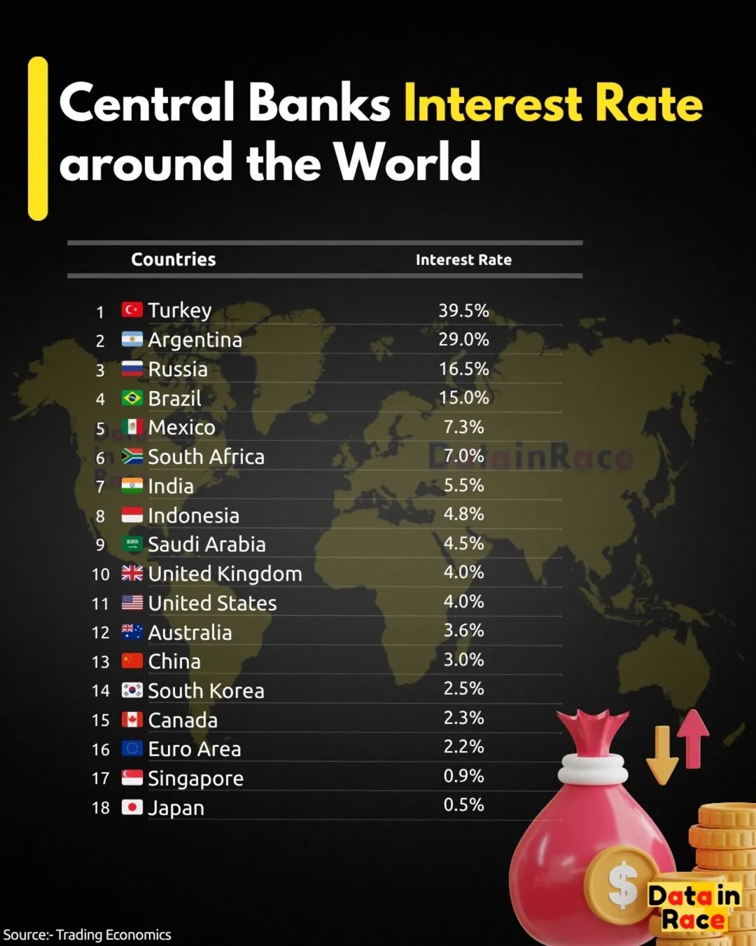 روزنو :بانک‌های مرکزی برای کنترل تورم و هدایت رشد اقتصادی، نرخ بهره را تعیین می‌کنند و تفاوت‌ها در این جدول کاملاً چشمگیر است. کشور‌هایی همانند ترکیه و آرژانتین برای مقابله با تورم سرسام‌آور، نرخ بهره را به‌شدت بالا برده‌اند، درحالی‌که ژاپن و سنگاپور با حفظ نرخ‌های بسیار پایین، به‌دنبال تشویق مصرف و سرمایه‌گذاری هستند.