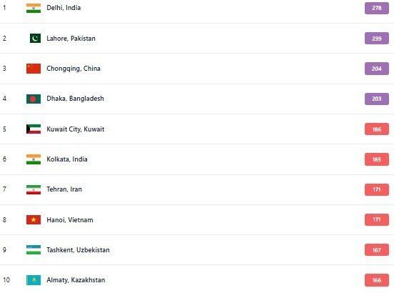 دادههای بهروزشده در سایت رسمی «IQAIR» نشان میهد «دهلی» در هند با شاخص کیفیت هوای ۲۷۸ و قرار گرفتن در وضعیت بسیار ناسالم، رتبه اول ۱۰ شهر آلوده جهان را دارد.